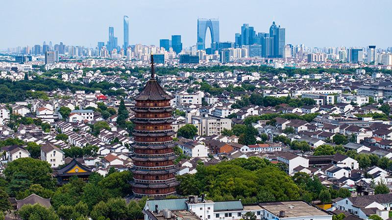 城門排列、街巷縱橫、水道交錯,歷經(jīng)歲月滄桑,如今的姑蘇古城與《平江圖》里的整體布局基本一致。一頭是古城最高點,始建于南朝梁時的北寺塔,另一頭是蘇州工業(yè)園區(qū)拔地而起的摩天大樓,二者穿越時空、遙相呼應(yīng)。